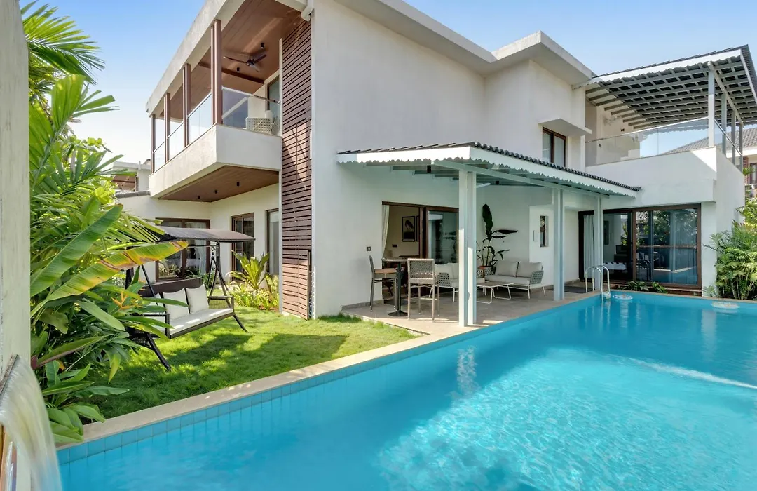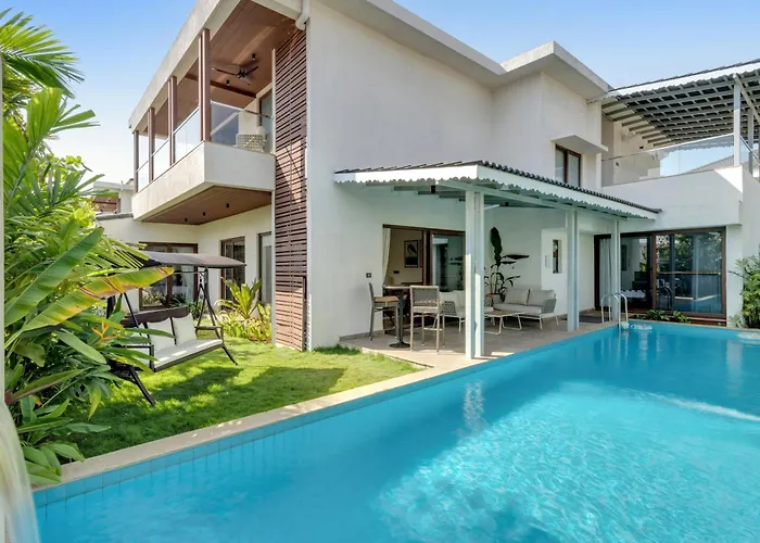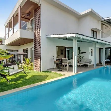 Die 5-Zimmer- Hireavilla Villa Inaari - 5Bhk With Private Pool In Anjuna liegt 4 km weit weg von der St. Alex Church und verfügt über eine Terrasse mit Blick auf den Garten.